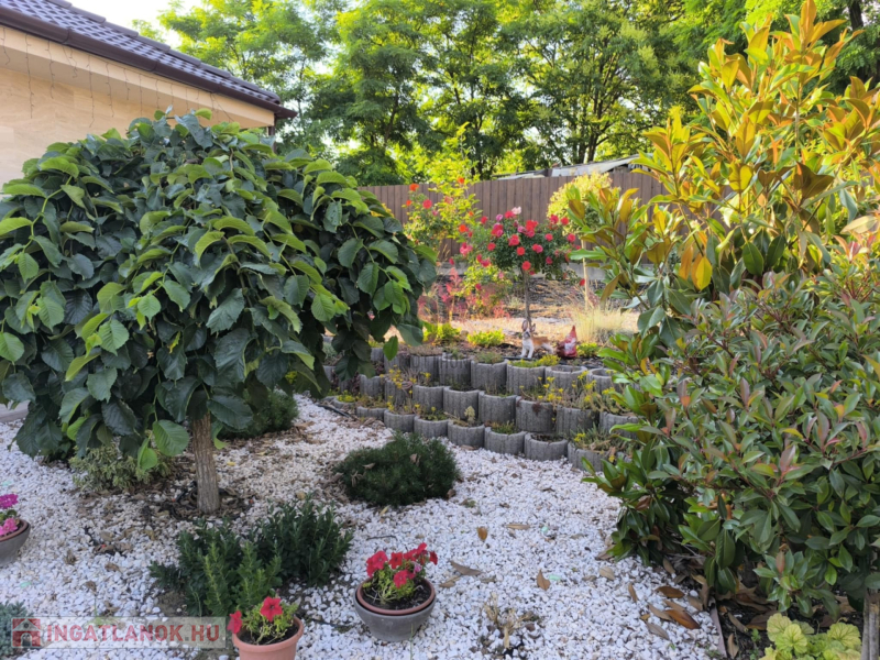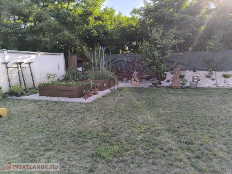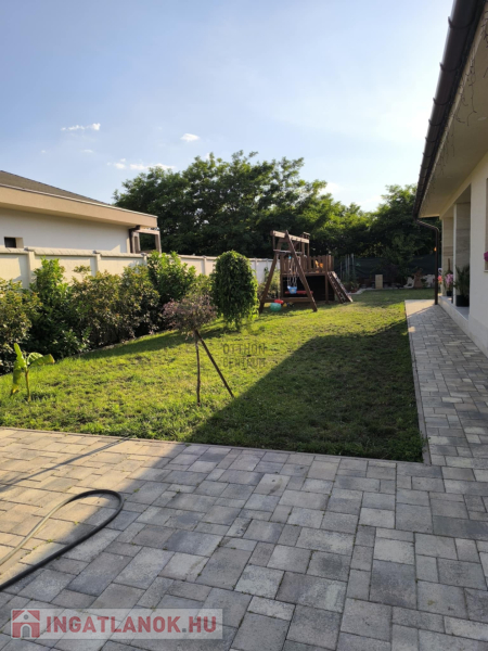 A házhoz tartozik egy 20 nm-es terasz és egy 20 nm-es nagyságú szerszámos kamra is. A kert szélső része automata öntözőrendszerrel van ellátva. A kertben a gyerekek részére kialakításra került egy játszótér is. A házban riasztó-rendszer került telepítésre, a kamera állások vezetékelve vannak.
