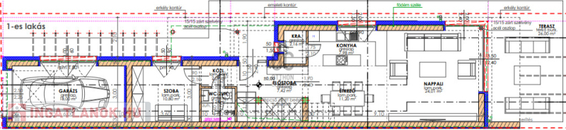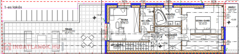1.lakás: - szoba – gardrób (23,1 m2) – fürdőszoba (6,66 m2) – közlekedő (7,4 m2)