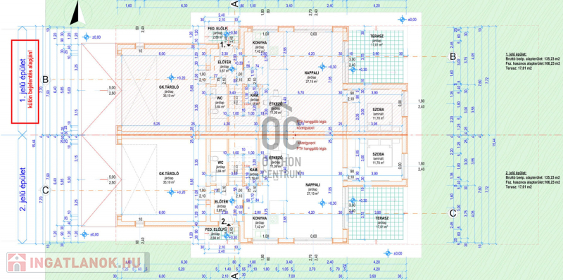 Földszint helyiségei : konya - étkező - nappali, szoba, wc, dupla garázs + terasz.