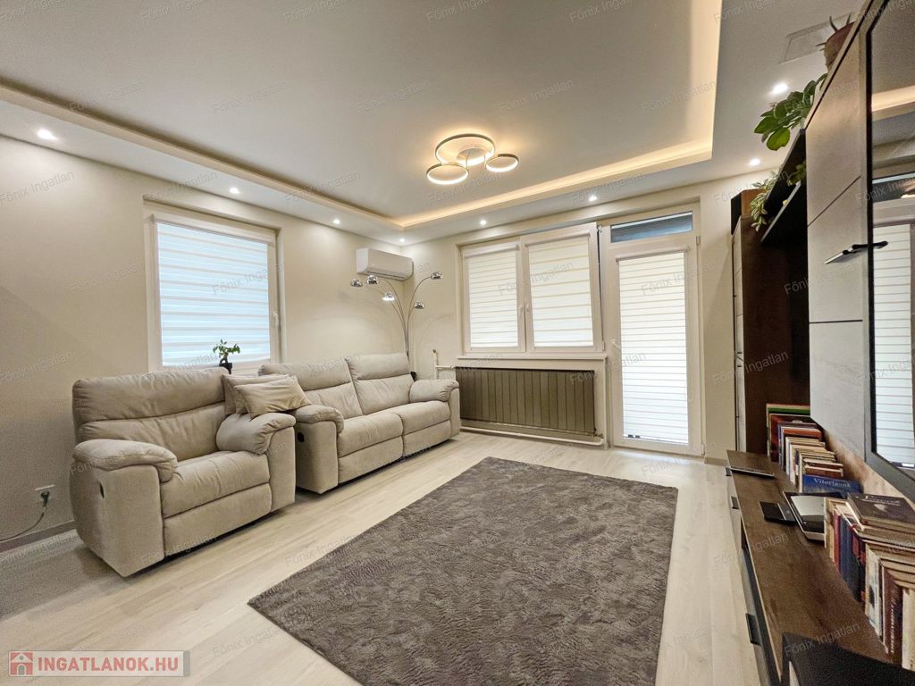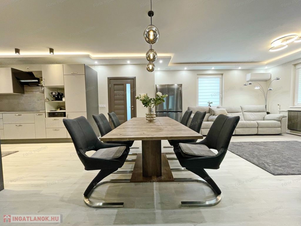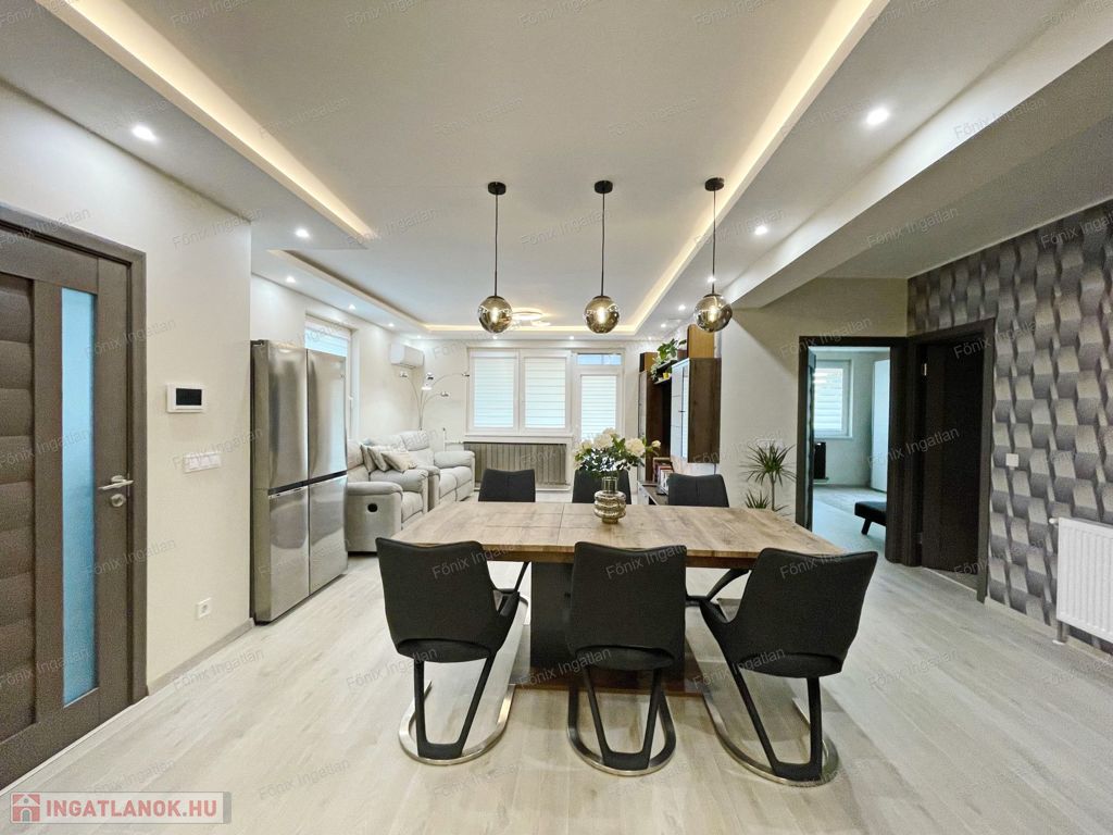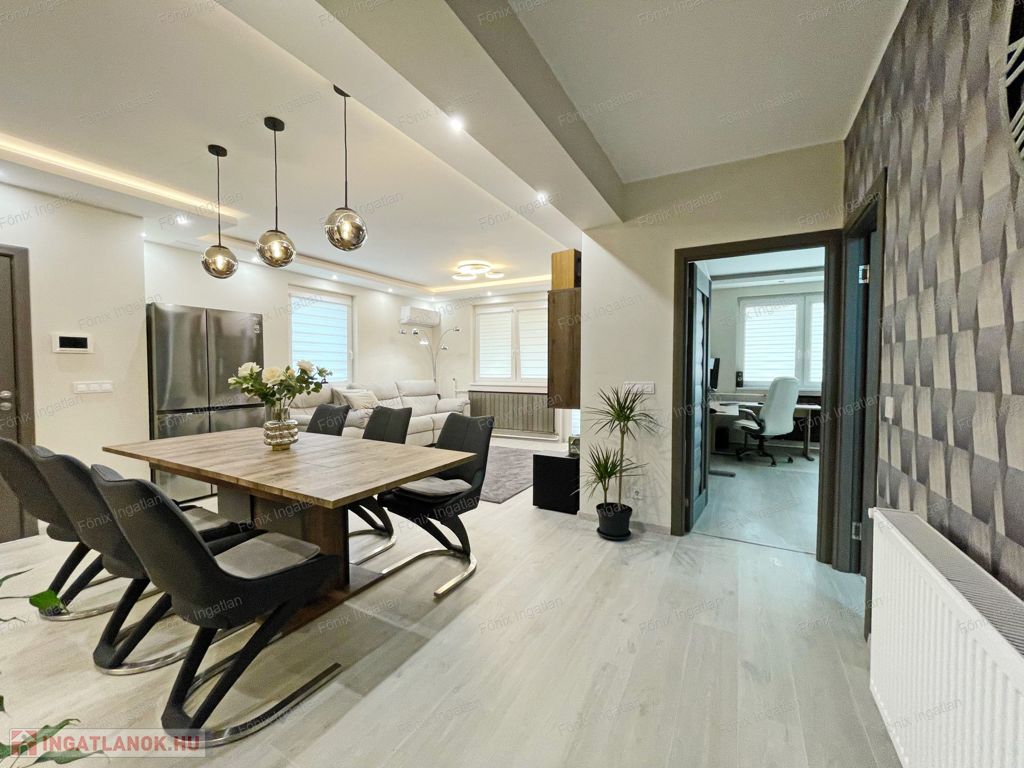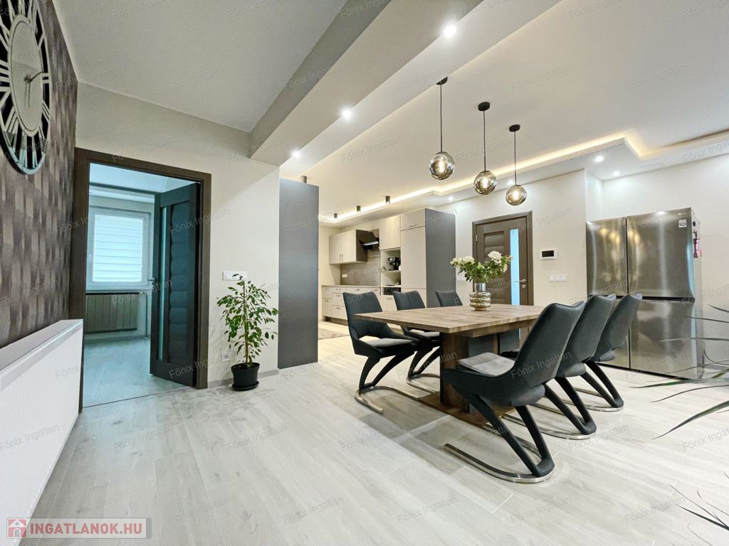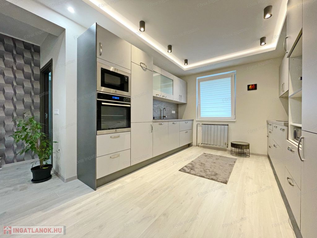 -első emelet: 92 m2, modern enteriőr, új és garanciás beépített bútorok, gépek, nappali-amerikai konyha, 2 hálószoba, fürdő-wc, erkély, teljes víz és elektromos rendszer cserélve,