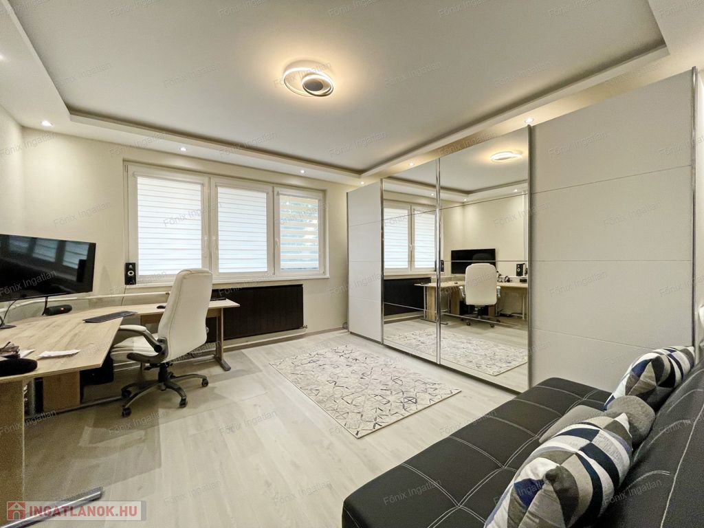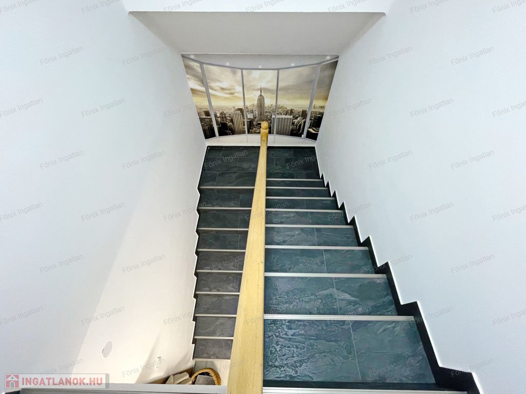 -záró szint: 80 m2, gipszkarton válaszfalazással kialakított nappali-étkezőkonyha, 2 hálószoba, fürdő és wc egyben. Itt burkolati és esztétikai felújítás nem történt.