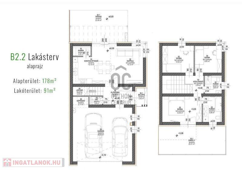 Garázs: két autónak, közvetlen belső kapcsolattal