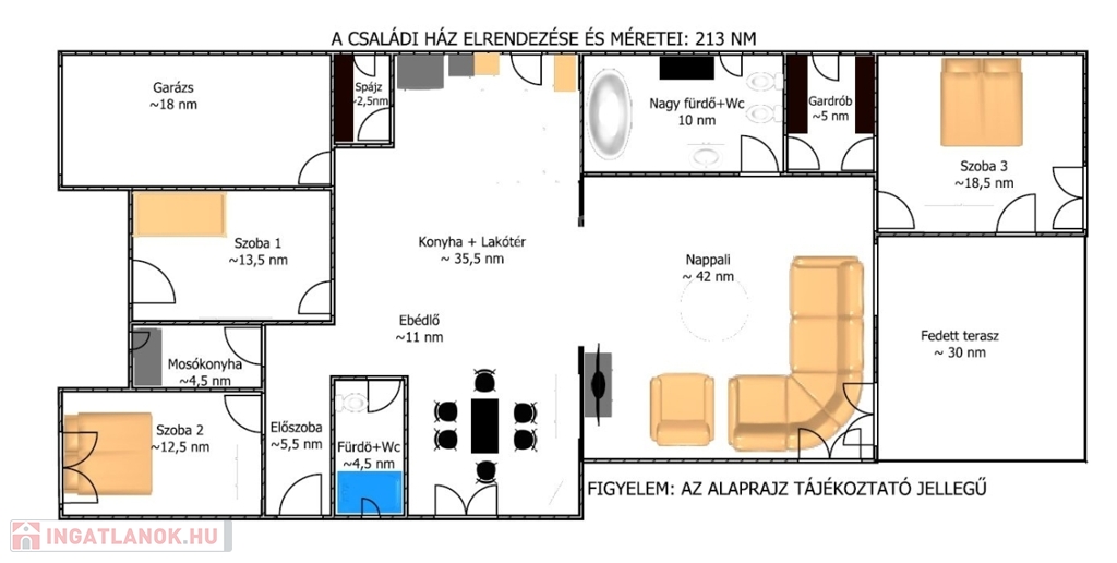 A családi ház hasznos alapterülete 183 nm, melyben található