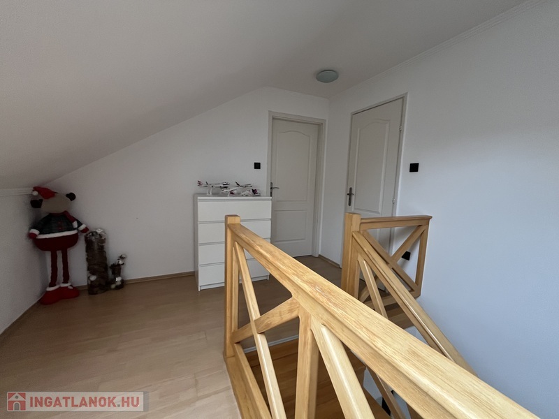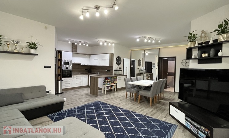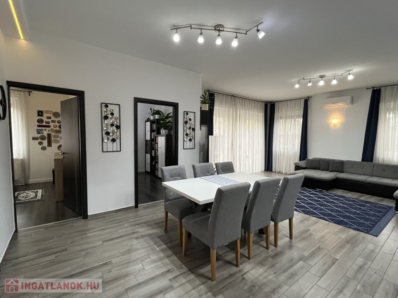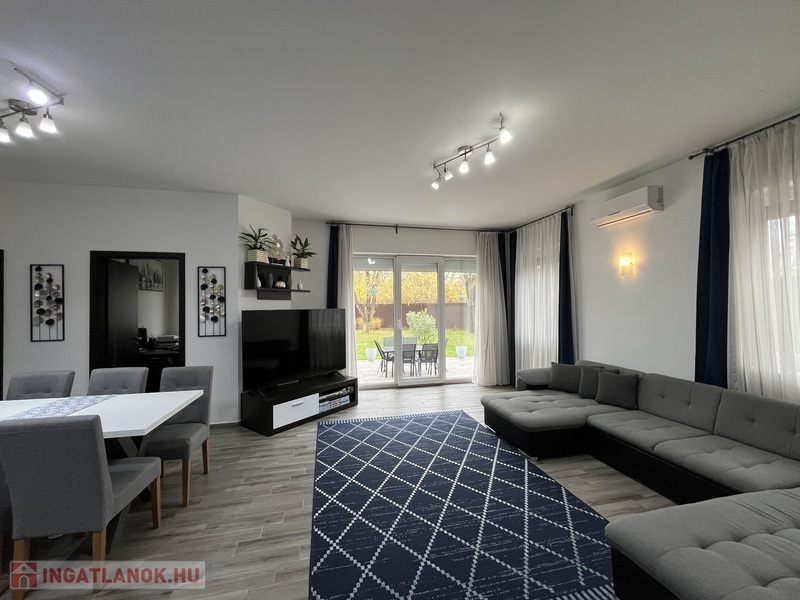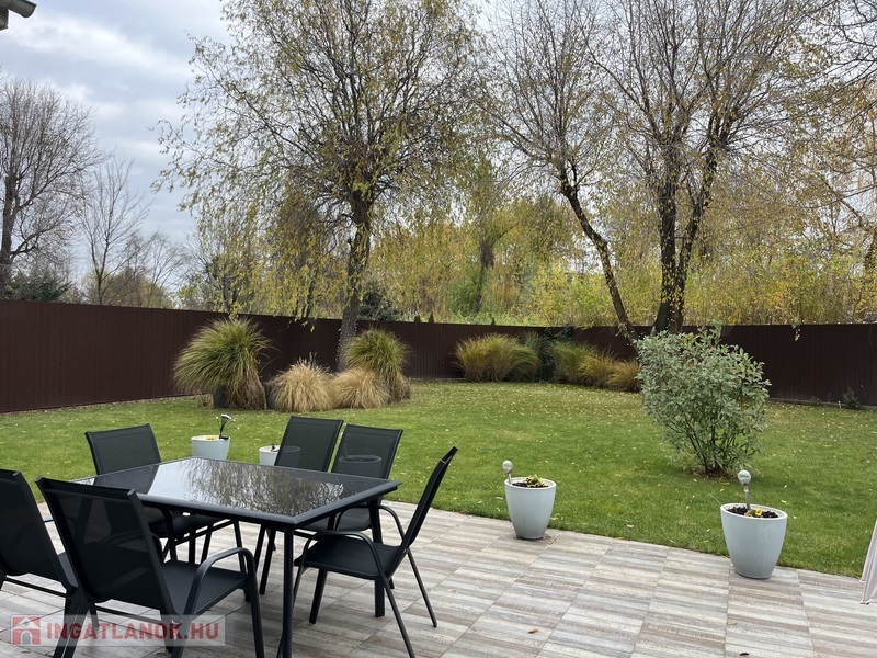 Eladó egy 141/120 m2-es, barátságos, tágas, világos 2+2 szobás sorház, hatalmas amerikai konyhás nappalival, 2 fürdõszobával, 2 WC-vel, nagy pihenõkerttel.