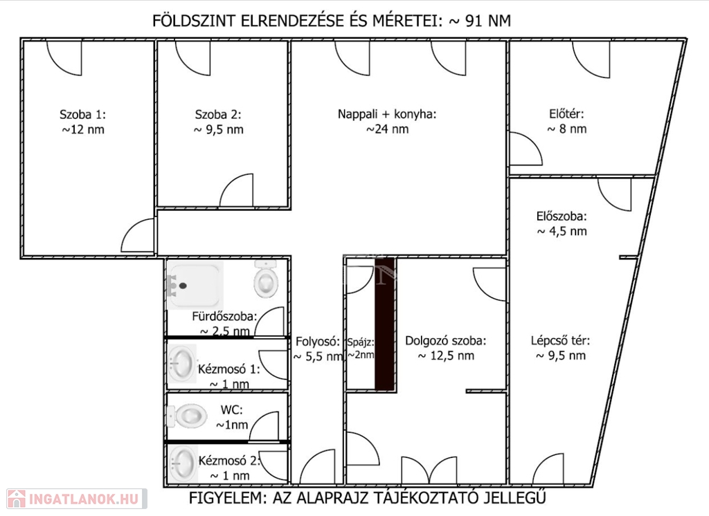 - Földszinten: előtér, mosdó+WC, fürdőszoba, folyosó, spájz, nappali-konyha-étkező, 2 szoba, dolgozó szoba, előszoba, lépcső tér.