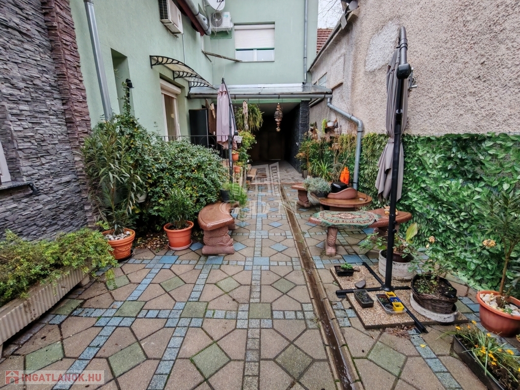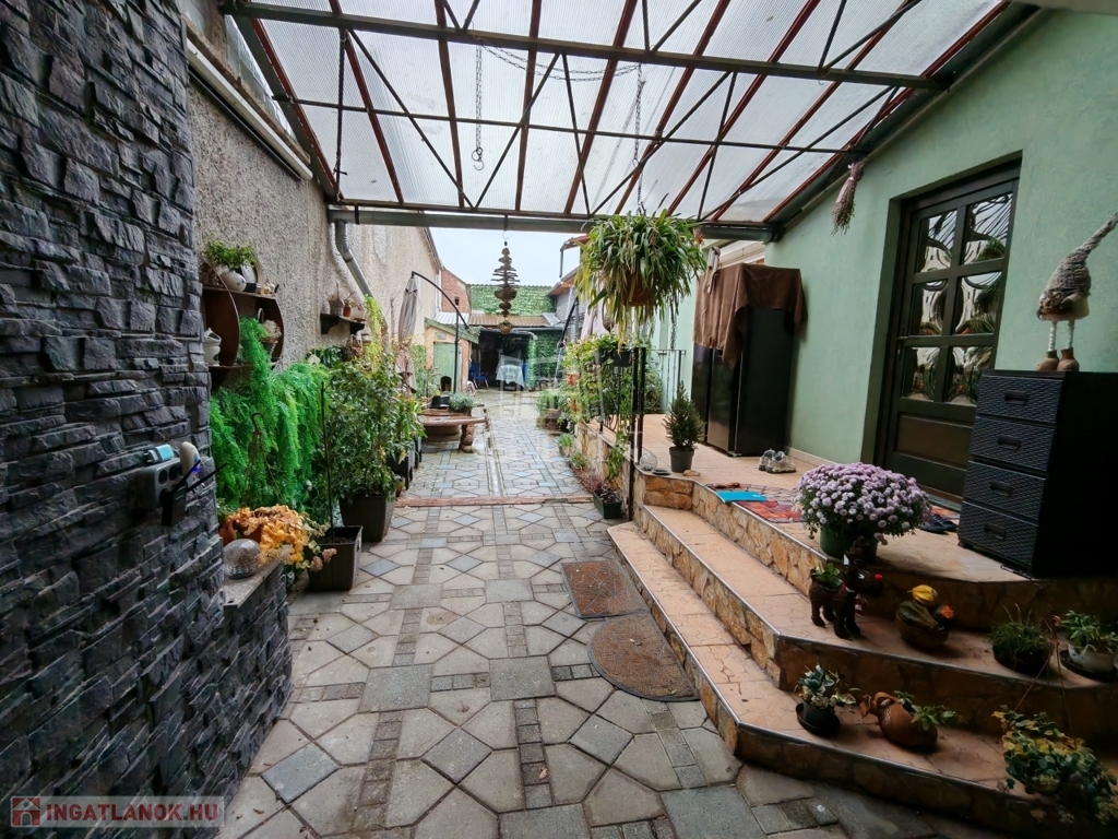 Egy 300 négyzetméteres szépen karbantartott és gondozott udvar van, melyen megtalálható egy fedett kocsi beálló, egy szép és rendezett sütő és gríllező hely padokkal. Továbbá található egy kinti tároló helyiség, illetve ami még fontos, hogy található egy fúrt kút, ami igény esetén a hálózatra köthető. A benti fedett beállón kívül még az épület előtt rendelkezésre áll egy autónak az ingyenes parkolás.