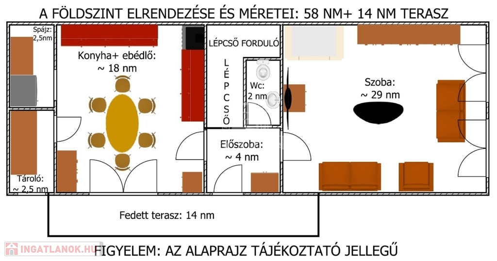 A fő épület hasznos alapterülete 192nm (+ 14nm fedett terasz) melyben található: