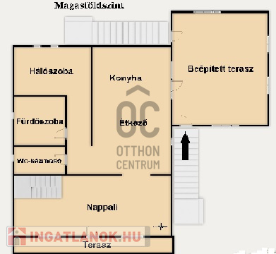 Magasföldszint helyiségei: beépített terasz/ előszoba, konyha-étkező, nappali, hálószoba, fürdőszoba, wc, terasz.