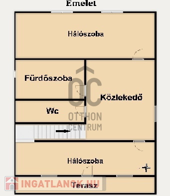Emelet helyiségei: 2 hálószoba, fürdőszoba, wc,terasz.