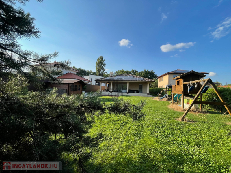 Csendes, kertvárosi környezetben, 1346 m²-es, teljes közműves telken eladó egy 2017-ben épült, egyedi tervezésű, kiváló állapotú családi ház, kiemelkedően alacsony fenntartási költségekkel és magas műszaki tartalommal.