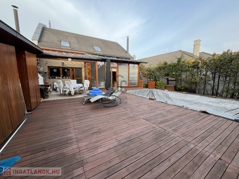 A kertkapcsolatot egy 22 m2-es, üveggel fedett, árnyékolóval ellátott terasz biztosítja. Itt található a kemence is. Majd a nyitott részben egy 6x4 m-es, 110 cm mély medence, beépített faszenes grill és mosogató is szolgálja a további kényelmet. Ideális helyszín a nyári összejövetelekhez, ahol a család és barátok kellemesen tölthetik el az időt.