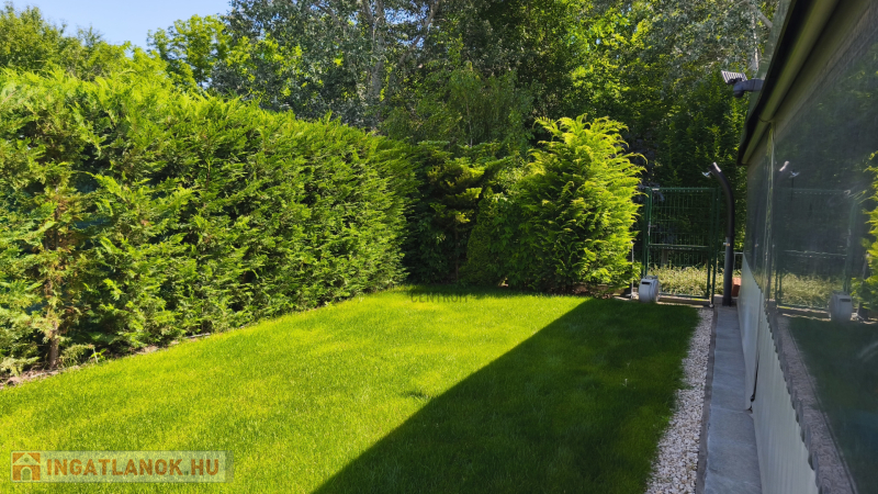 Kert : félig fedett terasz, 40 m2 - es igényesen kialakított , illetve berendezett filagória, öntözőrendszerrel állátott, parkosított udvar.
