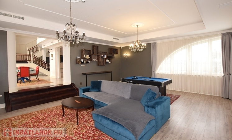 Földszinten található egy tágas nappali kandallóval, biliárdasztallal. Hatalmas étkező-konyha, mely elszeparálható igény szerint. A nappalin kívül van egy szintén tágas szivarszoba, mely használható társalgónak, irodának egyaránt vagy éppen egy külön lakrésznek is.