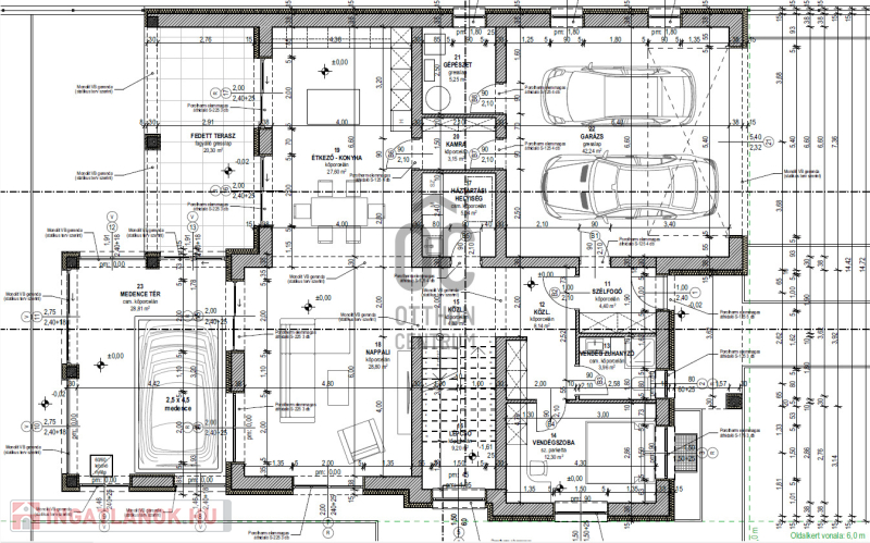 Helyiségei : 42 m2 - es garázs, amerikai konyha - étkező - nappali ( 56,4 m2 ), vendégszoba + zuhanyzó, fedett terasz, kamra, gépészeti helyiség + medence tér ( 28,81 m2 )