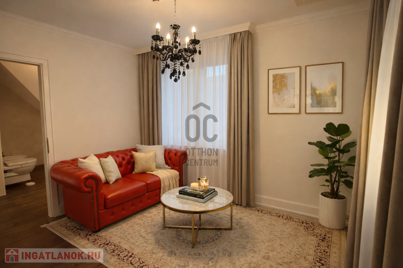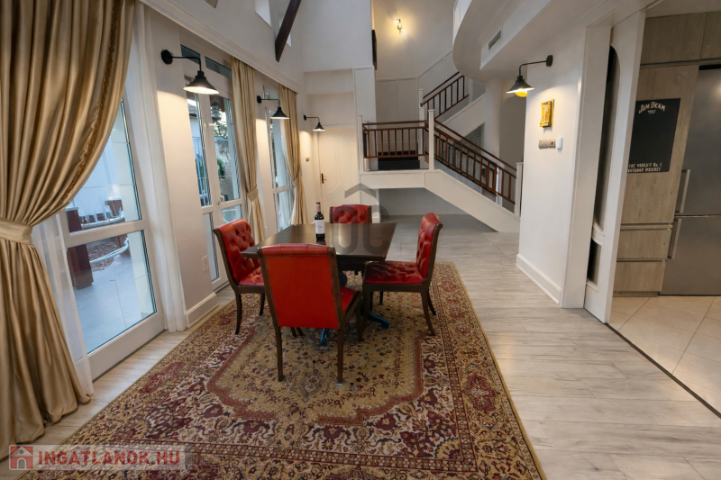 Az ingatlan egyik legkülönlegesebb eleme a lenyűgöző, 5,8 méteres belmagasságú étkező-nappali tér, amely villa hangulatot teremt.
