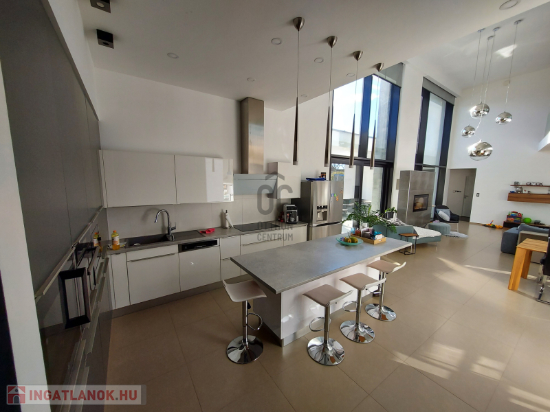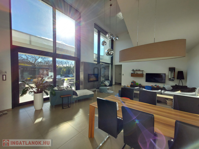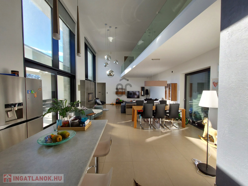 A ház három szinten terül el, hogy maximális kényelmet biztosítson a családja részére. A földszinten található tágas nappali, ÓRIÁSI mennyezetig érő, német Gealan, három rétegű üvegablakokkal rendelkezik, melyek gyönyörű kilátást nyújtanak a hatalmas teraszra és a gondozott, parkosított 1370 m2-es kertre, melyben egy ellenáramoltatóval felszerelt, fűthető, fedett medence lett telepítve.