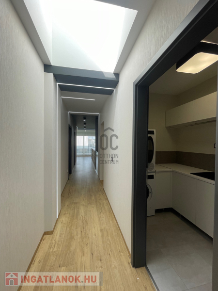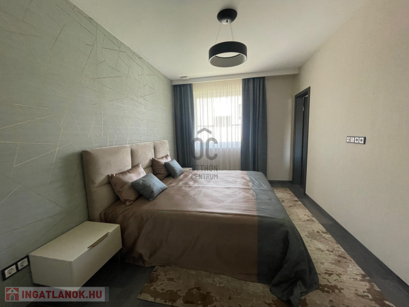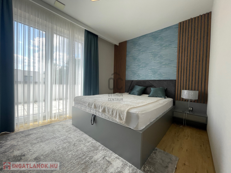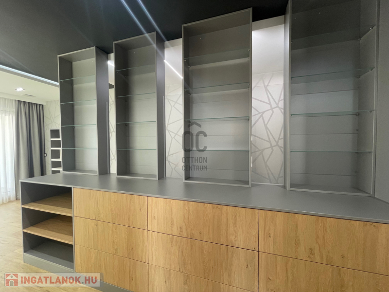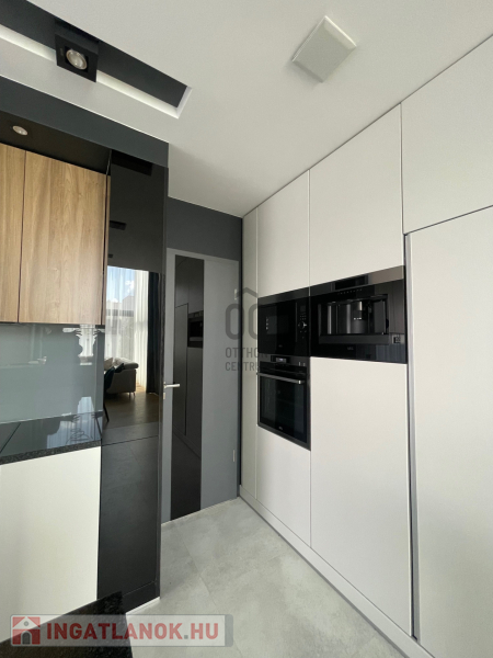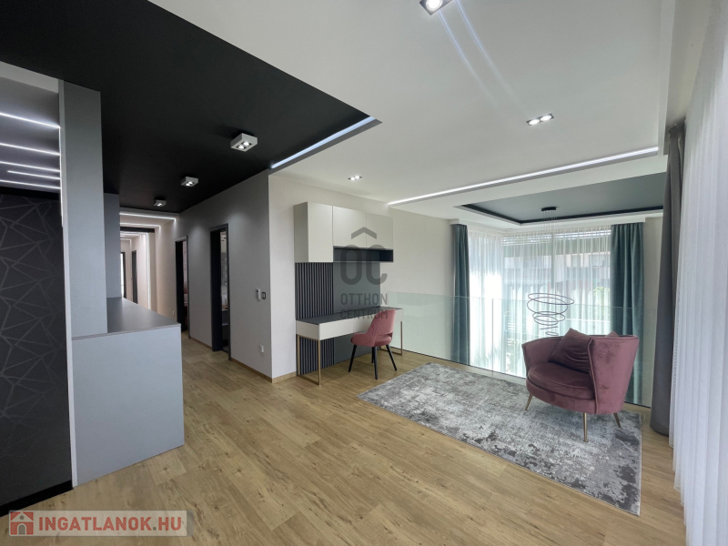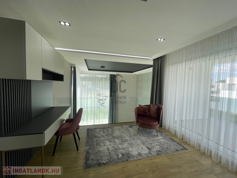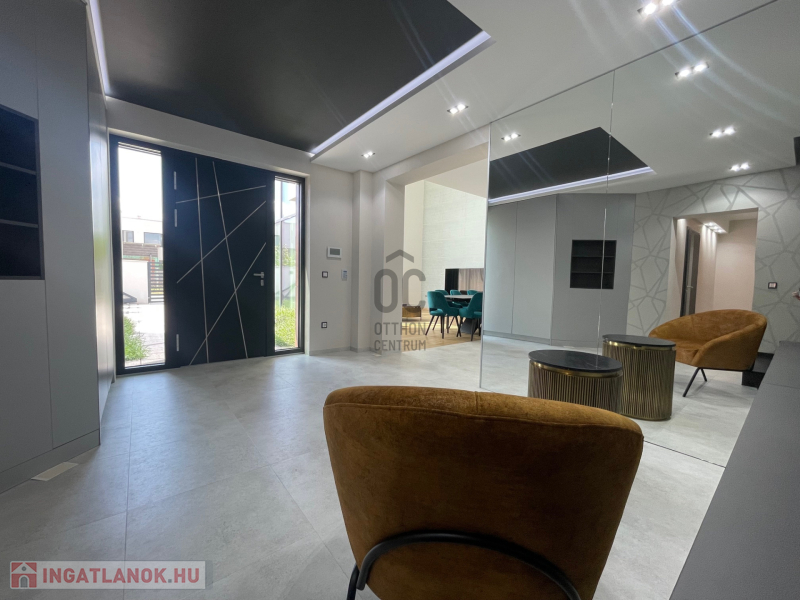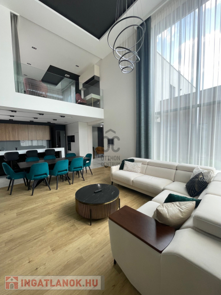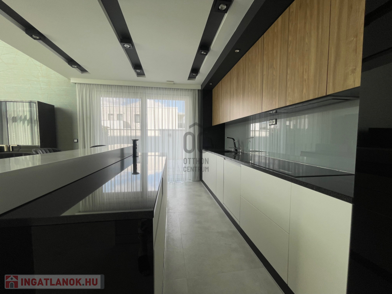 - Lélegzetelállítóan tágas, nagy belmagasságú, amerikai konyhás nappali padlótól plafonig érő üvegfelületekkel és közvetlen teraszkapcsolattal