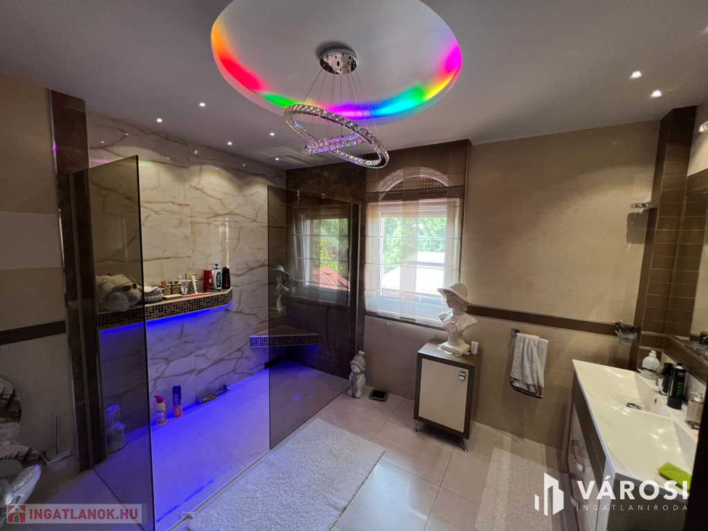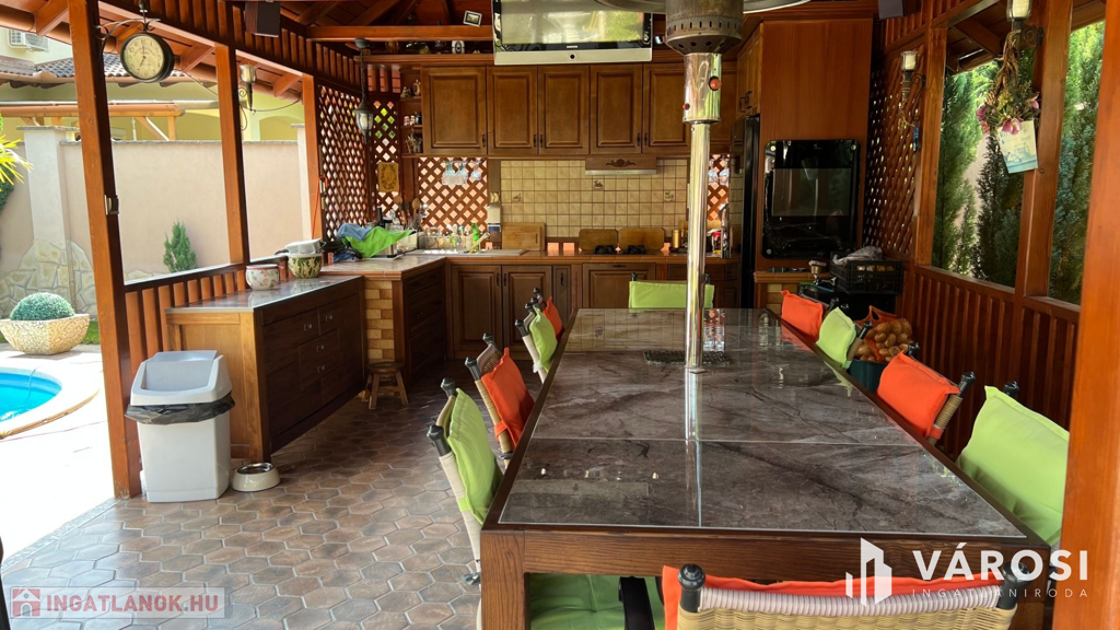 Debrecen kiemelt városrészén a Liget lakóparkban 332 nm-es önálló luxus ingatlan eladó. A ház alsó szintjén helyezkedik el a nappali, étkező, konyha, egy wellness rész zuhanyzóval, egy szoba, előszoba-hall, és egy wc. Természetesen a földszinti részen található még egy nagyméretű dupla garázs és egy terasz is. A felső szintre érkezve, egy nagy tér fogad bennünket, ahonnan eljuthatunk a három hálószobába, és a két nagyméretű fürdőszobába. A fenti szinthez tartozik még egy gardrobe szoba, egy mosókonyha, és minden szobához egy szép nagy terasz. A telek nagyméretű 760 nm-es + még egy hasonló méretű telekrész hátul, hozzá van kerítve. A kert szépen parkosított, és egy gyönyörű mindennel felszerelt filagória is helyet kapott benne. A filagória előtt egy fűtött medence is biztosítja a lakók kellemes luxusotthon érzését. Az ház magas műszaki tartalommal bír, és minden kényelmi extrával felszerelt, teljesen gépesített és bútorozott. És nem utolsó sorban Debrecen legelitebb városrészén található, igényes szép ingatlanok környezetében.