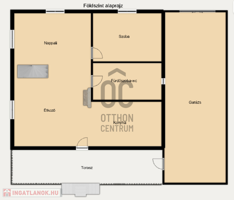 Földszinten található: 1 szoba, tágas nappali-étkező, konyha, fürdőszoba és wc.