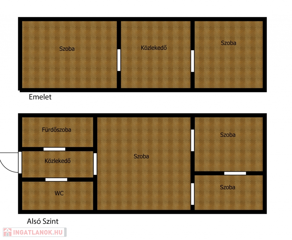 Két szintes, 5 szobás elrendezés: Az alsó szint akadálymentesített, így idősek vagy mozgáskorlátozottak számára is kényelmesen használható.