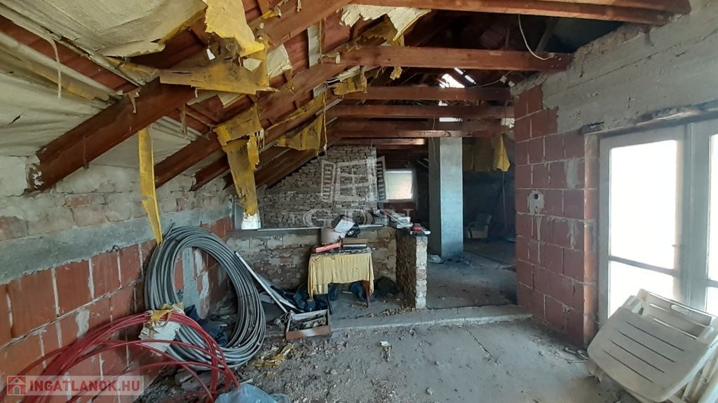 A főépület tetőterének hasznos alapterülete: 84nm + 13nm erkély. A tetőtér minden pontján legalább 180 cm a belmagasság, tehát teljes értékű, így rengeteg lehetőség nyílik számunkra. Képek között látható valós kép és jelenkori alaprajz, melyből látható milyen jó lehetőség. Kiépítése már félig megvalósult, a befejezése az új tulajdonosra vár.