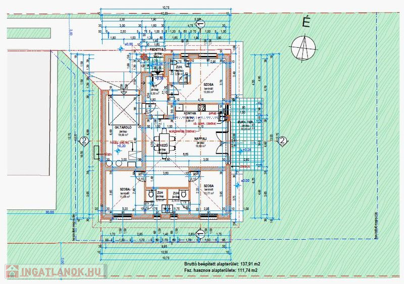 A házban 3 szoba került kialakításra, mind önálló, külön fürdõszobával, és WC-vel, ami fokozza a kényelmet. Tágas nappali, konyha, étkezõ egyben, elõszoba, garázs, plusz nagy teraszis épül a kertre nézve.