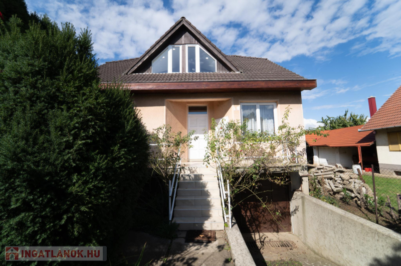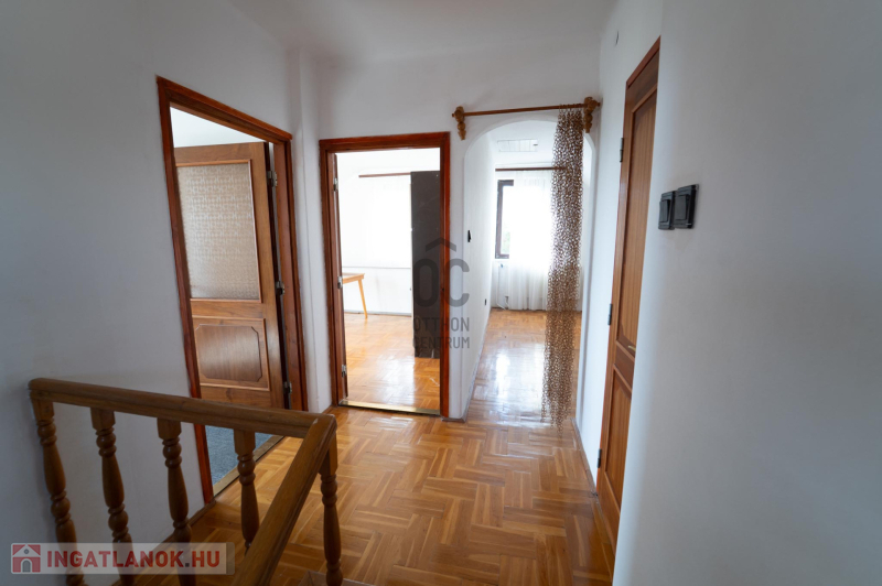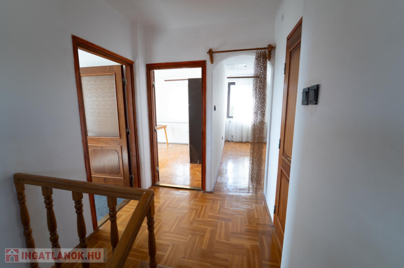 A 90-es évek elején épült, masszív szerkezetű családi ház két lakószinttel és teljesen alápincézett kialakítással rendelkezik. A pince szinten négy helyiség kapott helyet, köztük a garázs és a kazánház, ahol gáz- és vegyes tüzelésű kazán is biztosítja a fűtési lehetőségeket. Az alsó szinten a tágas előszoba után egy impozáns hall fogad, innen nyílik a 30 négyzetméteres nappali, az étkező és a konyha kamrával. Ugyanitt található egy hálószoba, egy fürdőszoba és egy külön wc is. A nappaliból egy 17 négyzetméteres fedett teraszra léphetsz ki, ahonnan a kert nyújt pihentető kilátást. Az emeletre széles falépcső vezet, ahol két nagyobb szoba került kialakításra, valamint egy kényelmes, világos fürdőszoba is szolgálja a család mindennapjait.