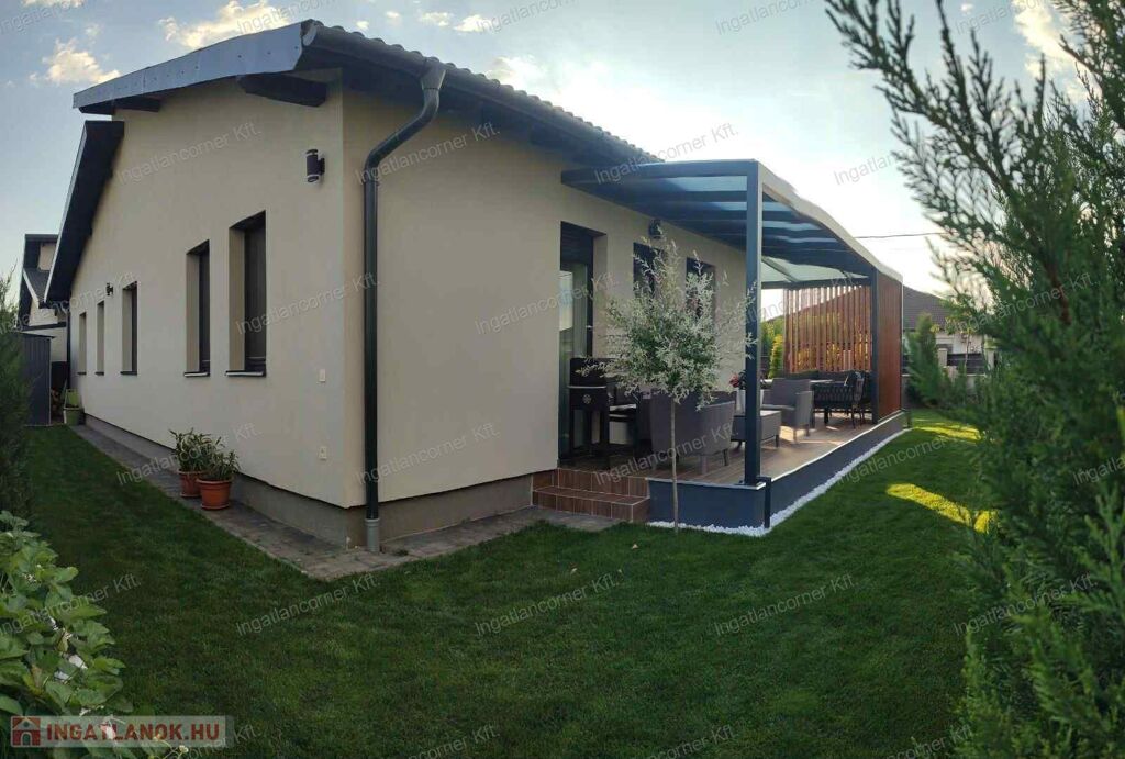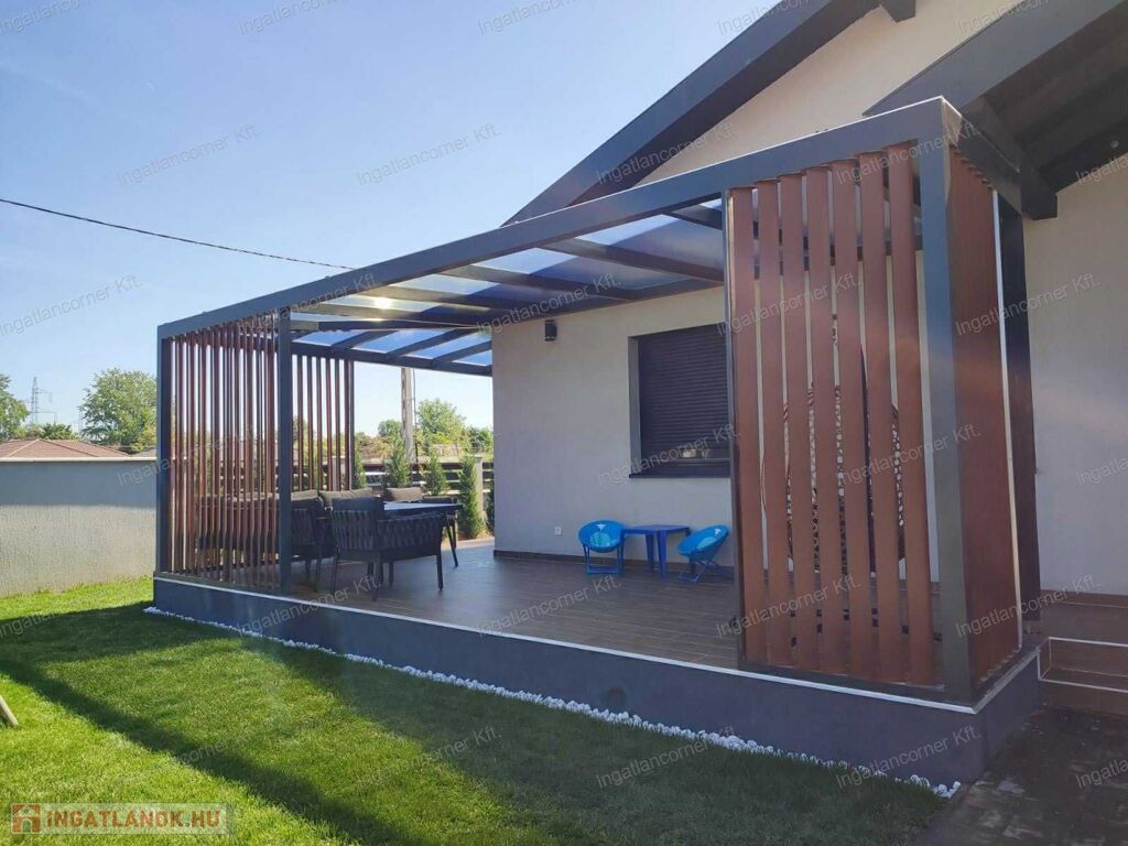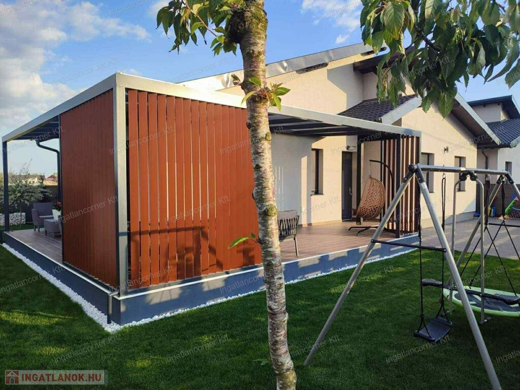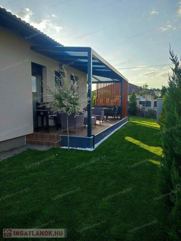 Terasz: 33 m²-es fedett terasz hővédő polikarbonát borítással, alumínium szerkezettel, rejtett esővíz-elvezetéssel és alu lamellákkal – tökéletes helyszíne családi ebédeknek, baráti összejöveteleknek vagy esti pihenésnek