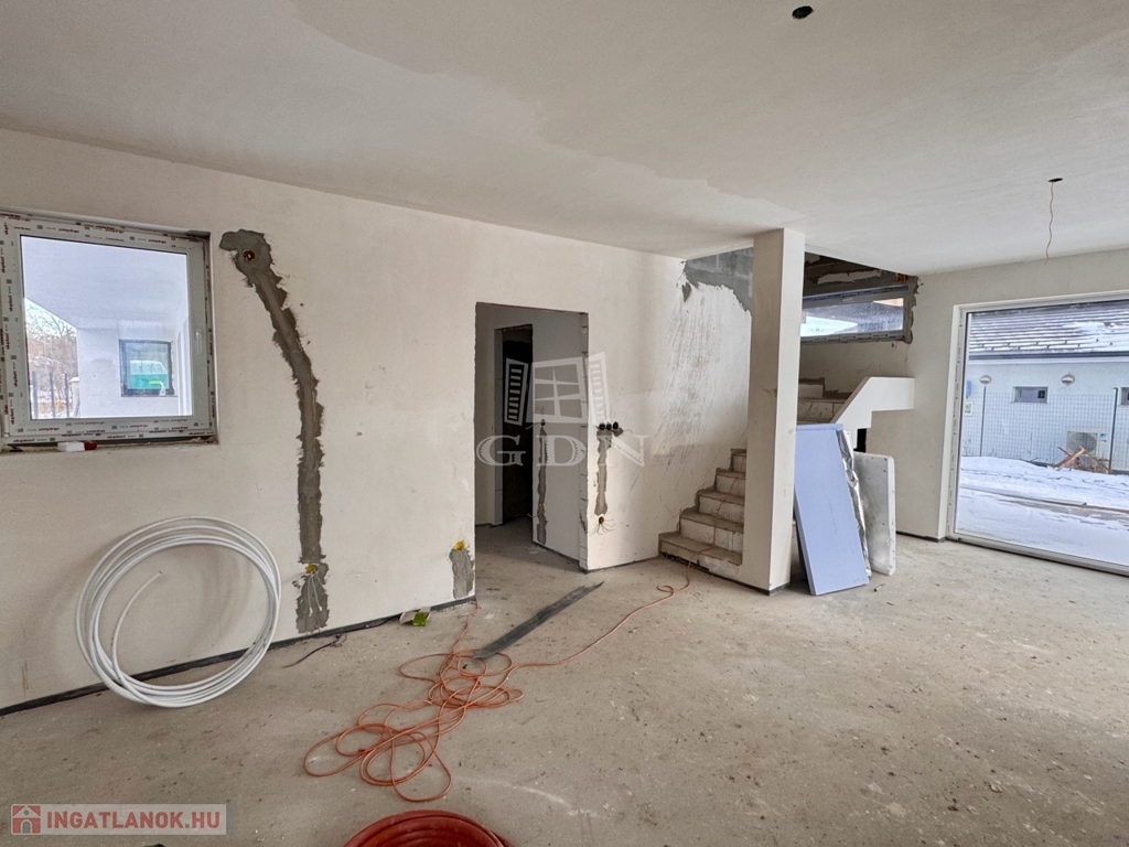 előszoba 4 m2, nappali-étkező+ konyha 28 m2, zuhanyozó +WC (5,27 m2), emeletre vezető lépcsőtér 3,3 m2, garázs 17,4 m2, plusz egy 22,5 m2-es terasz került kialakításra.