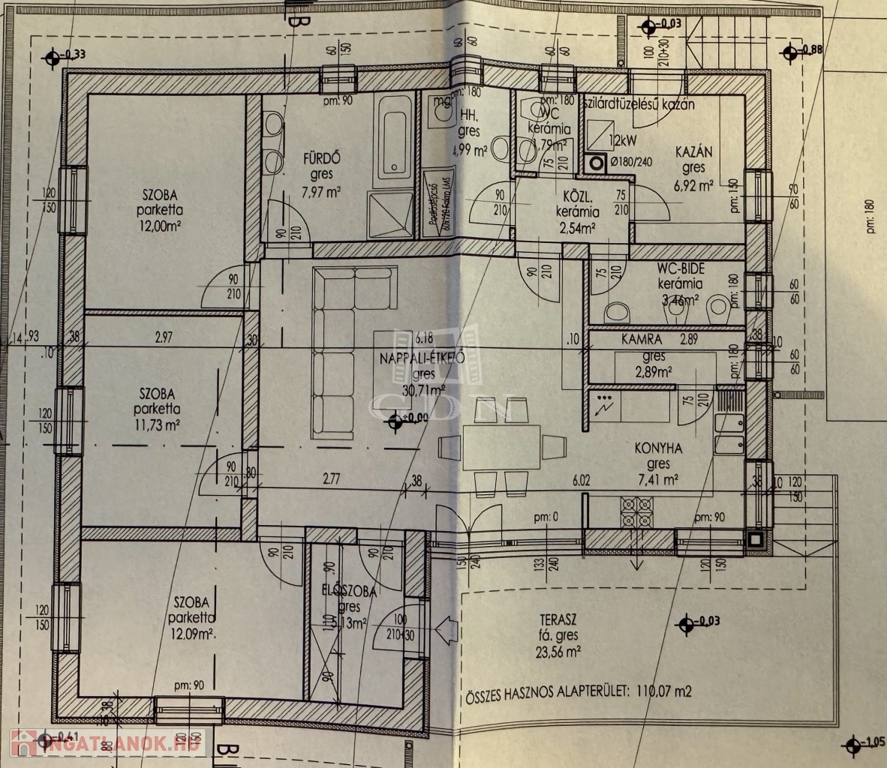 Nappali + 3 hálószoba + fürdő + 2 WC + kamra + háztartási helyiség