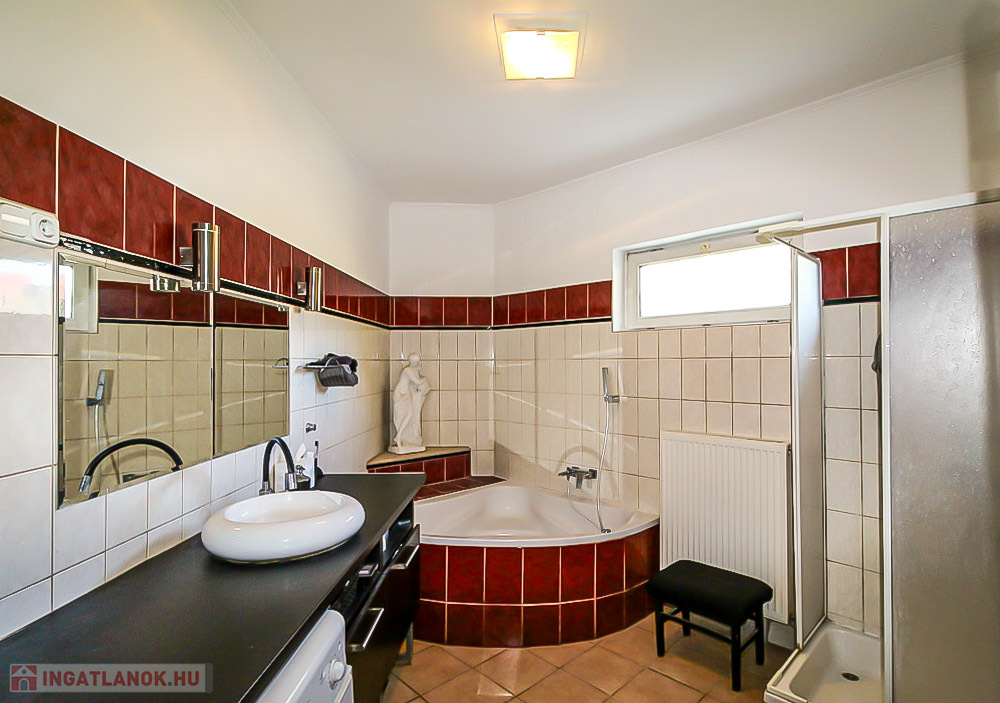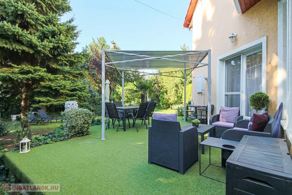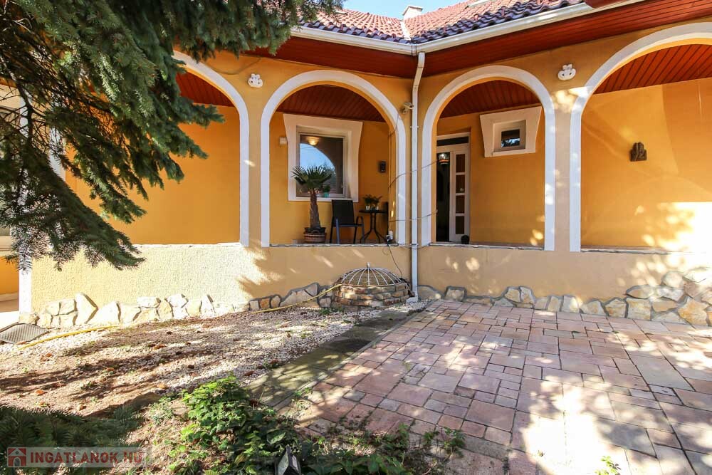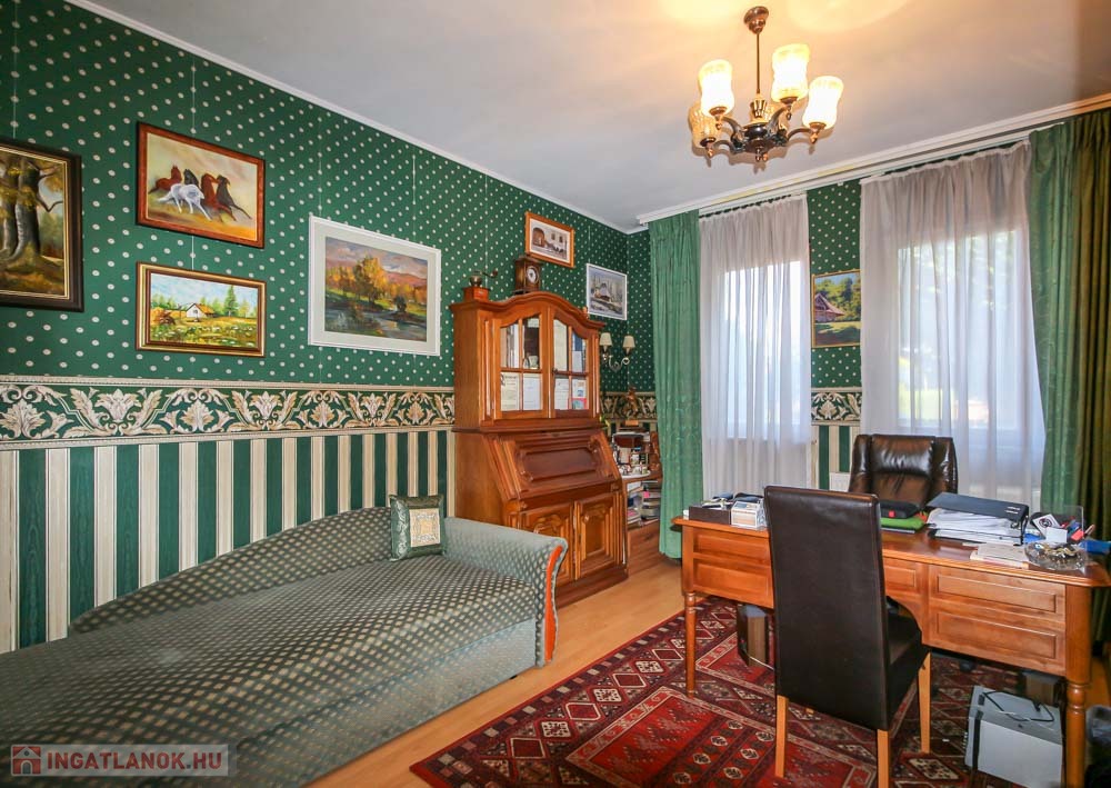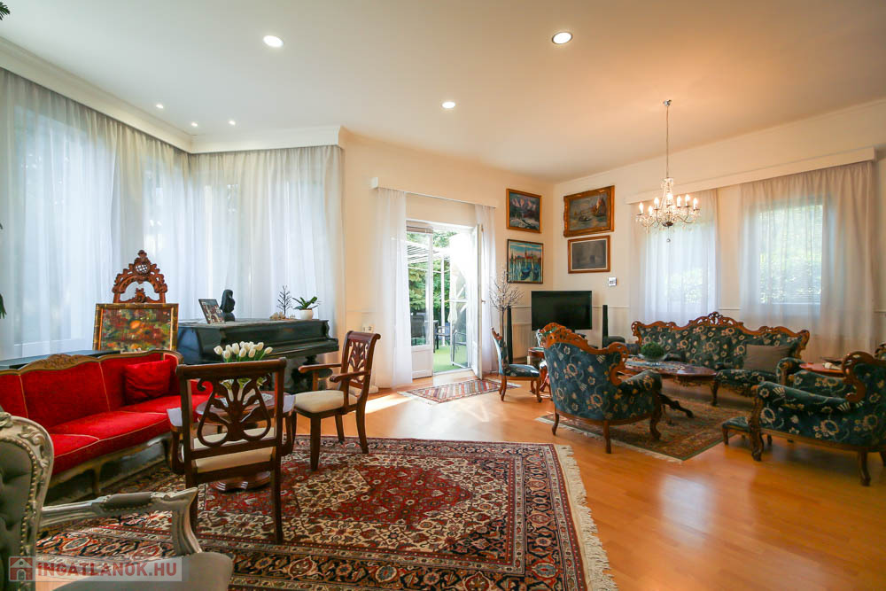 A szóba forgó klasszikus stílusban épült tornácos családi ház , a kíváncsi szemek elől elzárt ősfás park része, melyben az örökzöldeken kívül helyett kapott egy grillterasz, egy kerti tó és a garázson kívül udvari autóbeállók is. Az eladó ingatlan lakóterülete két szinten összesen 280 nm, mely jelenlegi elosztása szerint a hall-t, 2 fürdőszobát egyet szaunával, + 1 illemhelyet, 6 szobát egy nyitott nappalit takar. Utóbbihoz inkább a szalon megnevezést tartanám kifejezőnek, mivel e helység és a konyha, étkező együttese összesen 70 négyzetméterével a ház központi eleme, természetesen teraszkapcsolattal. Igazán impozáns a hatalmas ablakaival, boltíves díszítő elemeivel, kandallóval, bársarokkal, e helység belmagassága 3.4 m, ami csak emel a szinten.