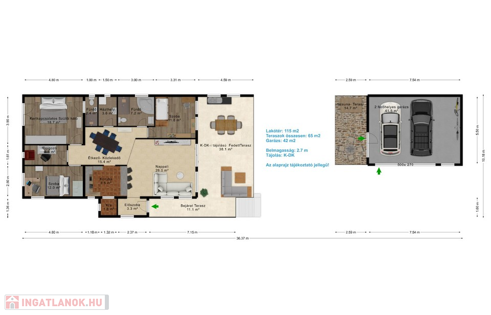 A nettó 115 m2-es, nappali + 3.5 hálószobás lakótér jól átgondolt, minden ott van ahol lennie kell és megfelelő nagyságú . A tetőtér beépítésével, igény szerint ez tovább növelhető. A helyiségek elrendezését, méreteit alaprajzon szemléltetem. Az élettér része tavasztól-őszig tovább bővül a 40 m2-es fedett terasszal, mely kiváltképp alkalmas a minőségi szabadidő eltöltésére, legyen szó kinti sütögetésről, vagy bármi másról. Az autók elhelyezésére egy kb. 44-es kétférőhelyes garázs áll rendelkezésre, mely további tároló kapacitással bír.