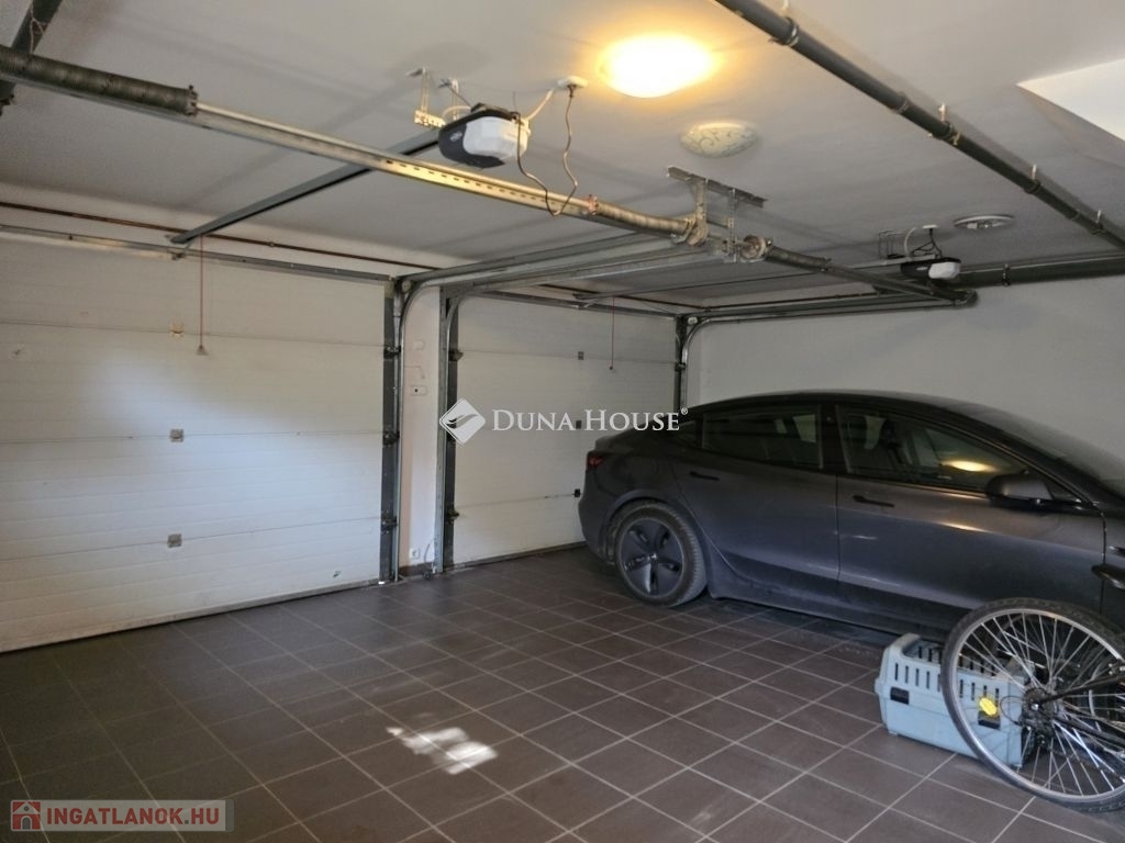 Parkolni a házkapcsolatos dupla garázsban lehet, de van további autónak térkövezett beálló is.