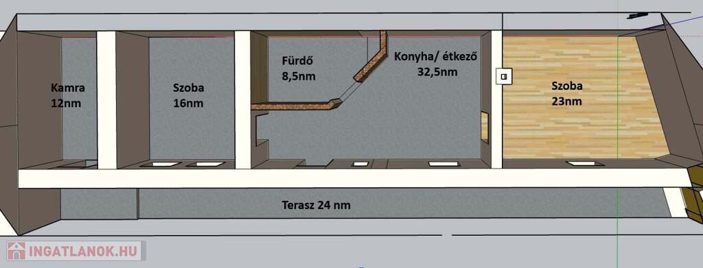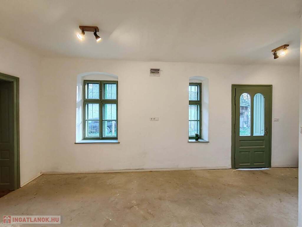 Belső terek: Az egyik szobában a régi, eredeti fenyő hajópadlót megmentettük, felcsiszoltuk, és újra festettük – ez a ház éke! A többi helyiség nem burkolt, üres vászon a leendő tulajdonosnak