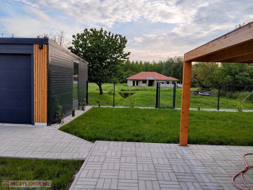A ház 1780 m2-es részben térkövezett, parkosított telken fekszik, kétoldalt betonkerítéssel, hátul 3D-s fém kerítéssel határolt. Továbbá helyet kapott a telken egy 30 m²-es garázs is, mely elektromosan nyitható.