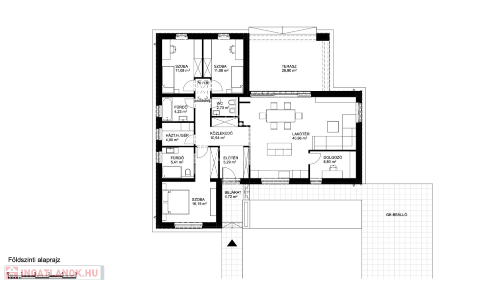 - tágas, amerikai konyhás nappali-étkező (41 m²)