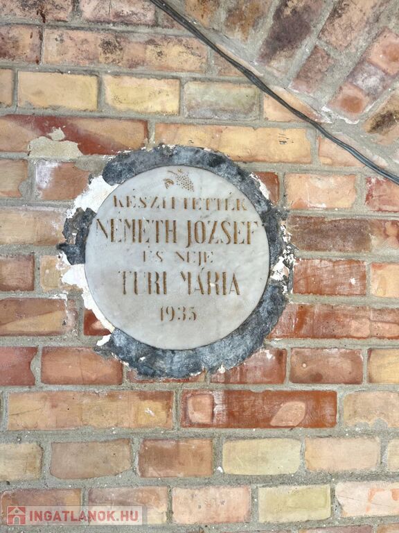 A ház alatt egy igazi különlegesség található: egy 38 m²-es, téglával kirakott borospince, melynek falán az eredeti építési dátumot megörökítő emléktábla is látható – ritka és értékes hangulati elem.