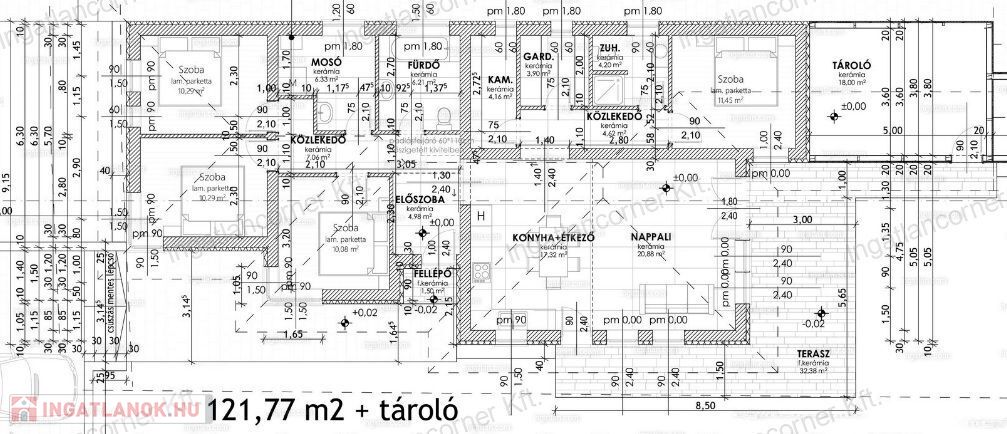 Az első ingatlan (utcafrontról nézve), 540 m2 telekrésszel rendelkezik, 122 m2 alapterületű, nappali + 4 hálószobás. Az ingatlanhoz tartozik, + 33 m2 terasz, + 18 m2 külső, zárt tároló.