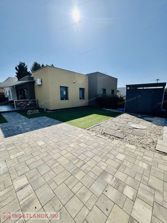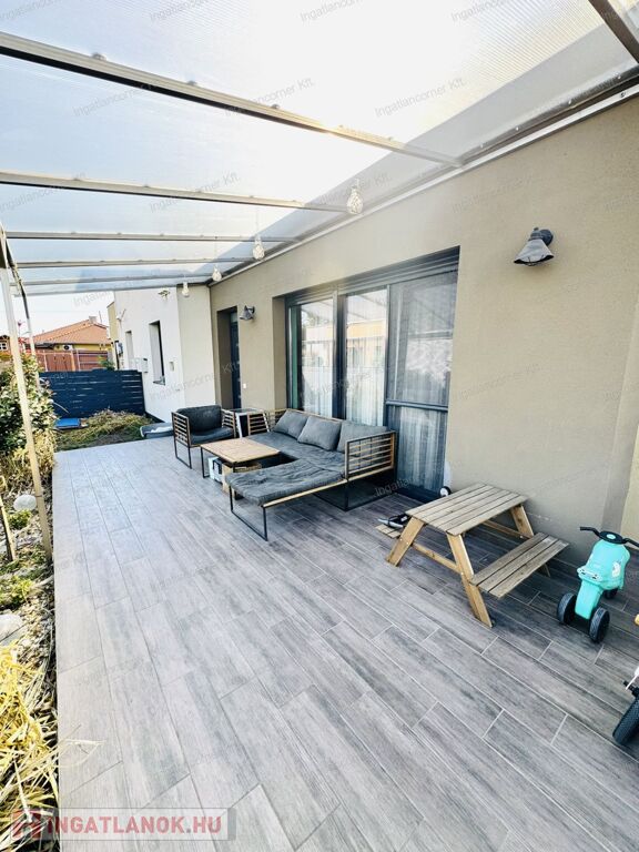 2019-ben épült, modern és különleges hangulatú ikerház eladó Dunaharaszti egyik legkedveltebb, csendes, zöldövezeti részén, a Bezerédi lakópark zsákutcájában.