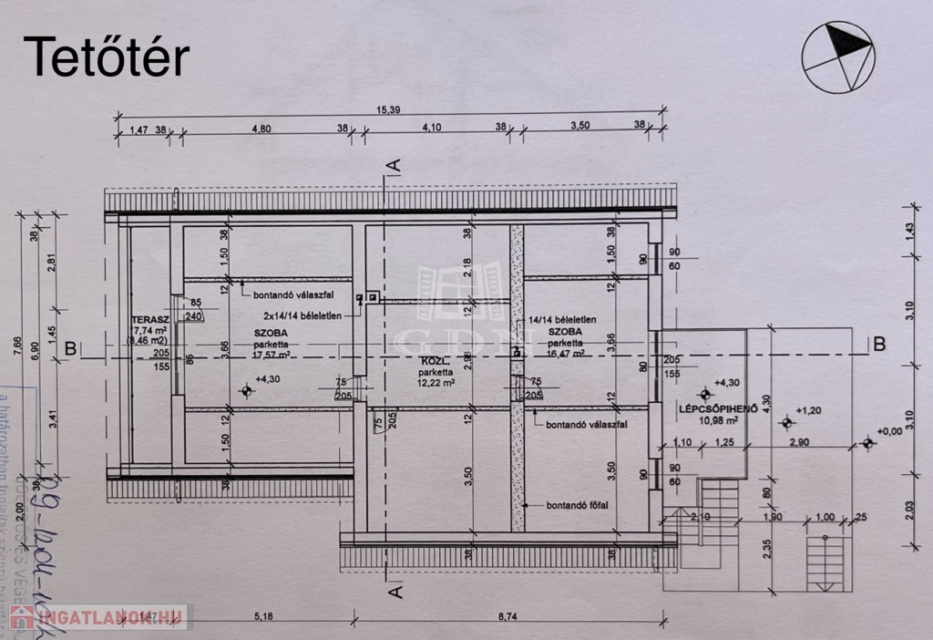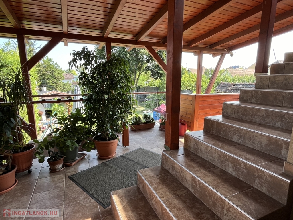 A tetőtéri szinten egy nettó 103 nm-es lakás+ 11 nm lépcsőfeljáró+ 7,74 nm erkély alakítható ki, jelenleg a felső szint külső lépcsőn közelíthető meg így teljesen külön lakásként müködhet, vagy a régi belső lépcső visszaállítására is van lehetőség.