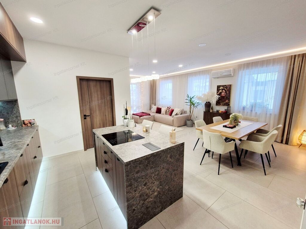 A modern konyhát egy FUNKCIÓNÁLIS KONYHASZIGET egészíti ki, amelybe beépített hosszabbító, valamint egy ELECTROLUX indukciós főzőlap került elhelyezésre, számtalan plusz tárolóval, így a mindennapi használat és a főzés egyaránt kényelmes és hatékony. További beépített konyhagépek: WHIRLPOOL 12 terítékes beépített mosogatógép, toronyba épített, ELECTROLUX légkeveréses sütő, SAMSUNG beépített mikrohullám sütővel.
