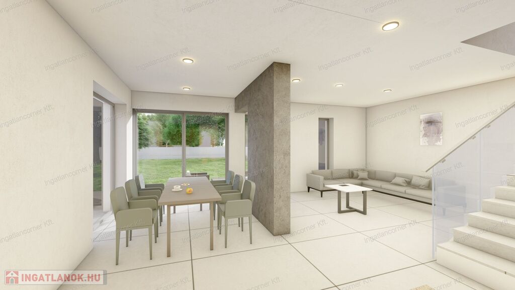 Az alsó szinten helyet kapott egy tágas amerikai konyhás-étkező, nappalival, valamint mellékhelyiség mosdóval.