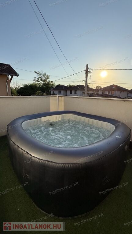 A hatalmas méretű teraszon a virágok és kerti bútor szett mellett kényelmesen elfér a jakuzzi is. A teraszon elektromos sötétítő rendszer lett kiépítve hangulatvilágítással (ennek ára 10 millió Ft újonnan).