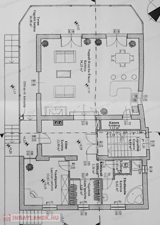 A földszinten hatalmas D-Ny. tájolású terasz található, mely nappali illetve hálószoba kapcsolatos, kilátással a ráckevei Duna egyik kis ágárra. Hátsó szomszéd így a jövőben sem várható.