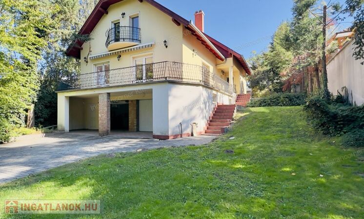 Enyhén lejtős, kettő utcára nyíló telek, gyönyörűen parkosított, ősfás, kerti tavas terület, kerti szaletlivel, gyerek játszóval.