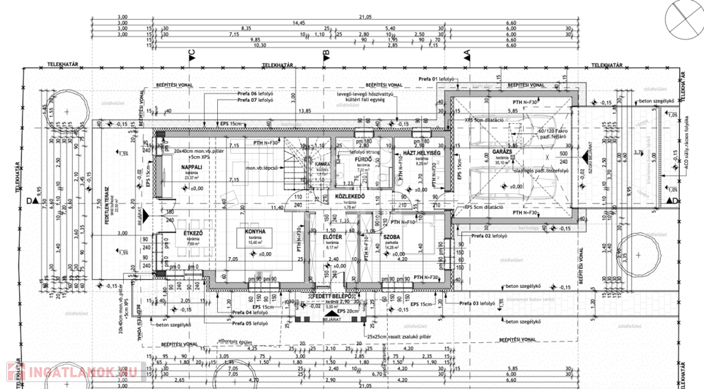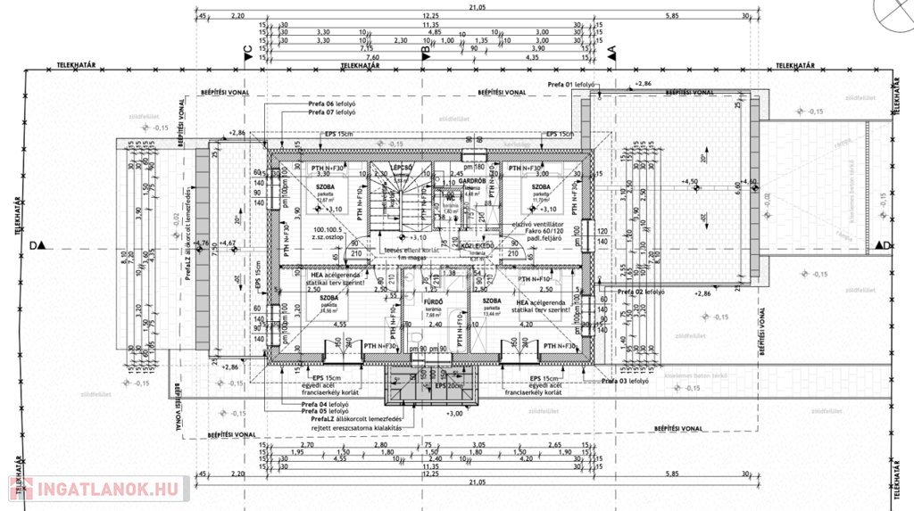 - főfal 15 cm EPS, aljzatban 12 cm, födémen 25 cm szigetelés