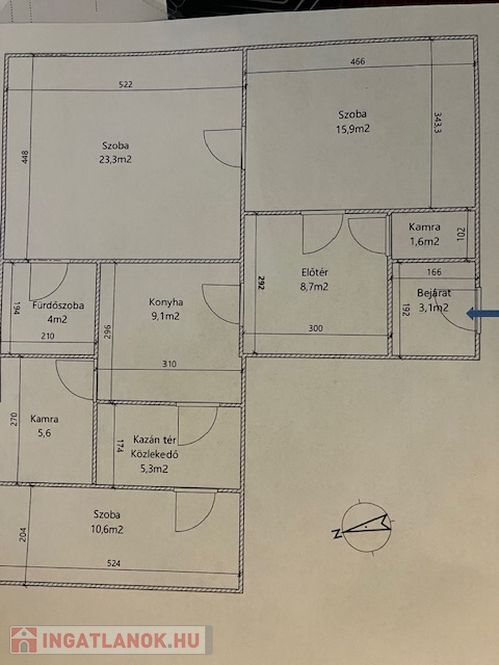 Elosztása: előszoba,wc,nappali,3 külön bejáratú szoba,fürdőszoba,kamra,kazánház.
