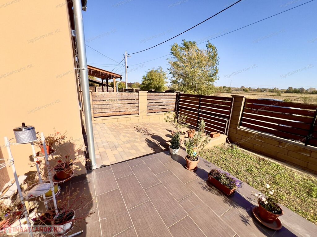 Elrendezését tekintve kiváló: térkövezett kocsibeálló a lakás kertjében 1 db autónak, előszoba, am-konyhás jó méretű világos nappali, kamra, zuhanyzós fürdő (wc-vel), nappaliból kilépve 20 nm-es terasz kapott helyet, továbbá 2 hálószoba ( 15 és 10 nm). Saját 200 nm telek, körbe kerítve.