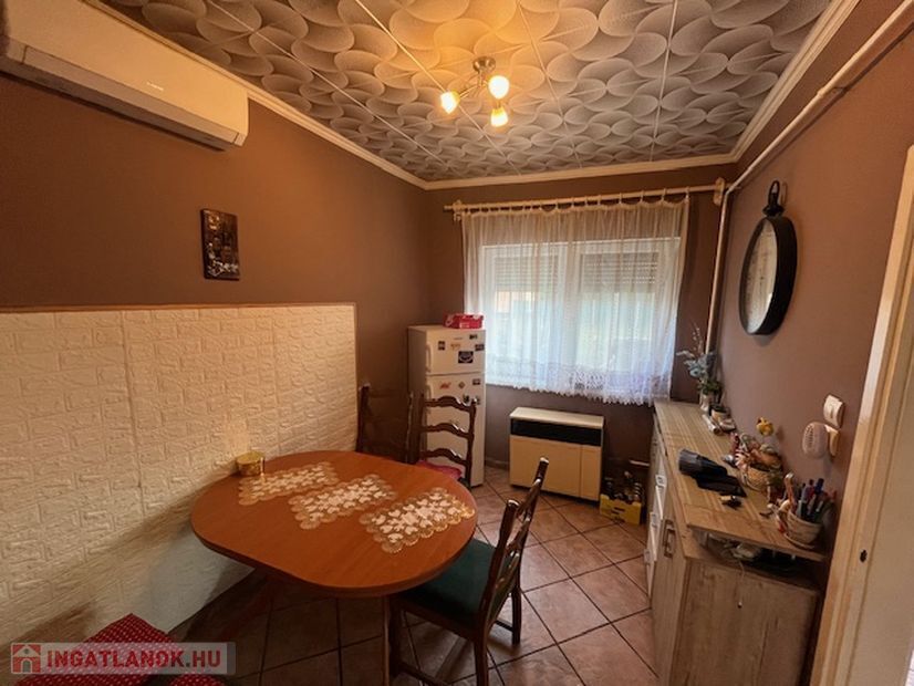 Elosztása:-előtér,közlekedő, 2 külön bejáratú nagy szoba, konyha, étkező, kamra, fürdőszoba, wc.