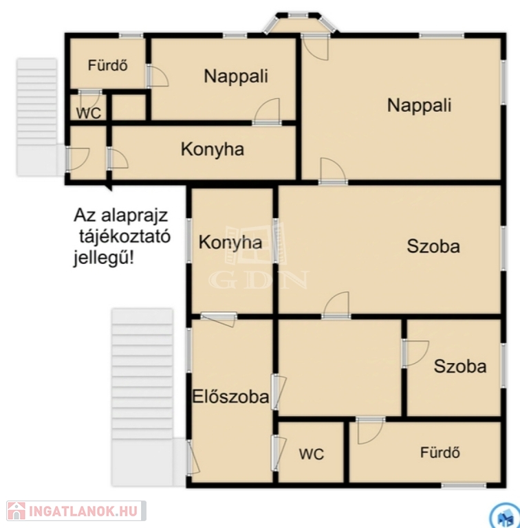 A kisebbik nappali, konyha, fürdőszobából áll, a nagyobbik pedig hatalmas nappaliból, két szobából, konyhából, fürdőszobából és wc-ből. Külön bejárat, külön lépcsősor, a két lakás teljesen elszeparált egymástól.